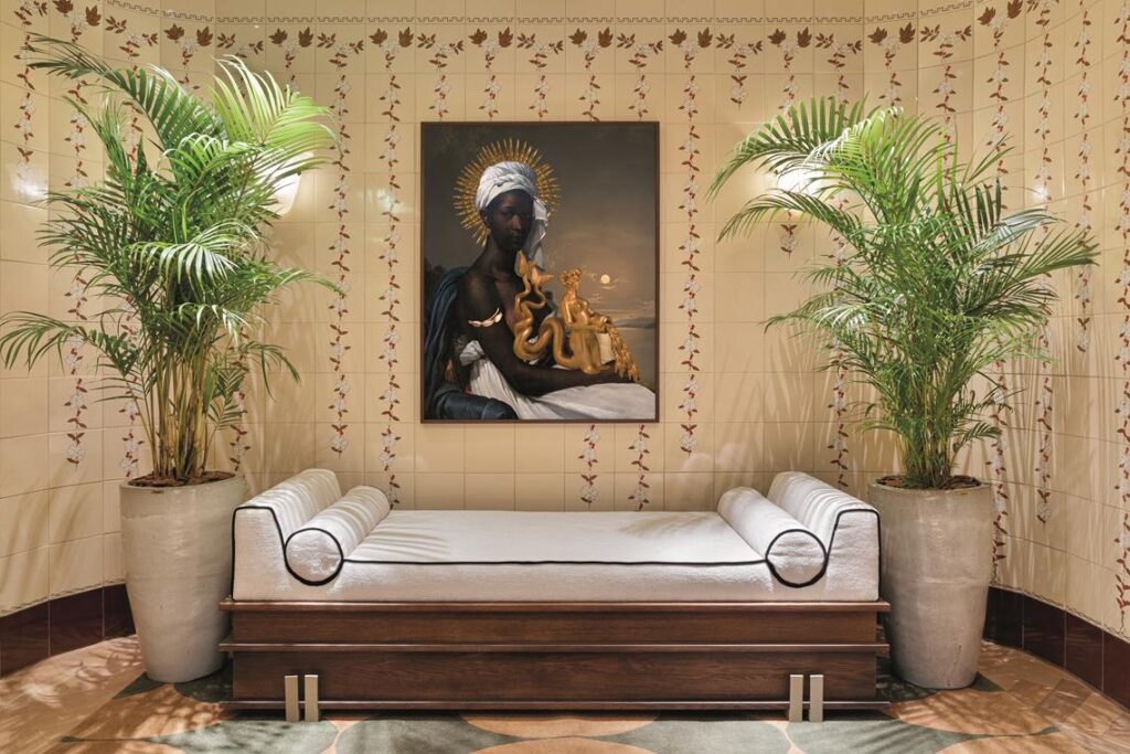 A espiritualidade também se manifesta de forma marcante no espaço Eternum Vitae, do La Rous Studio, da arquiteta Larissa Perna, com a obra “Aeternitas”, de Renan Benedito.