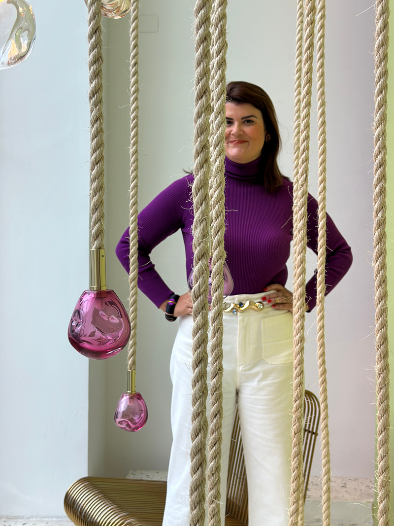 Com a sede de seu escritório em Florianópolis atuando no Brasil e no Exterior, Juliana assina a Coleção Cipó para a Itens Collections, com direção criativa de Mariana Amaral. Nascida em 2023, a primeira peça foi o pendente de cordas de sisal trançadas manualmente e finalizadas com esferas de vidro soprado, permitindo composições que se ajustam de acordo com o espaço onde será instalado. Desde então, a linha ganhou ampliações incluindo o lustre com acabamentos em latão e metal, além de pendentes de tamanhos diferentes.