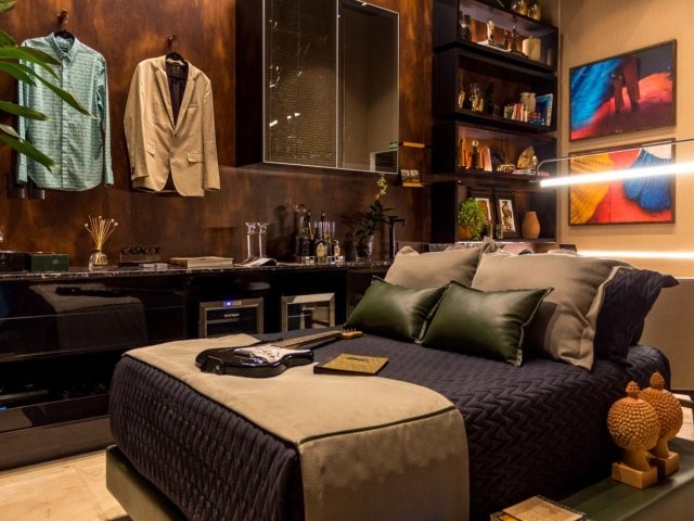O destaque do estúdio vai para o mobiliário em tons amadeirados e terrosos que imprimem sofisticação. “Tem tudo a ver com o requinte do homem contemporâneo”, comenta.