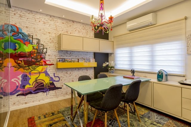 A movelaria de todo o escritório é de laca em tom pastéis, quebrados por uma explosão de cores com destaque para a parede revestida em papel de parede na forma de tijolinho envelhecido grafitado e, por cima, com a arte de Kbeça (grafiteiro que faz intervenções urbanas relevantes em Feira). Em contraponto, na outra parede foi utilizada a técnica de pintura em cimento queimado, que serviu de fundo para as telas vibrantes do pintor Galeano.