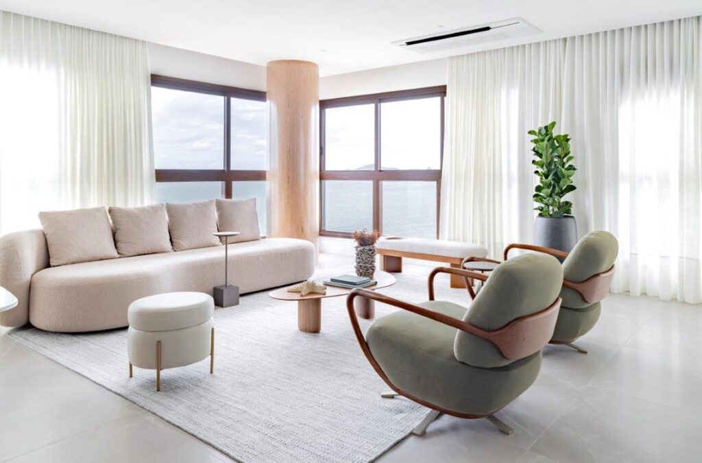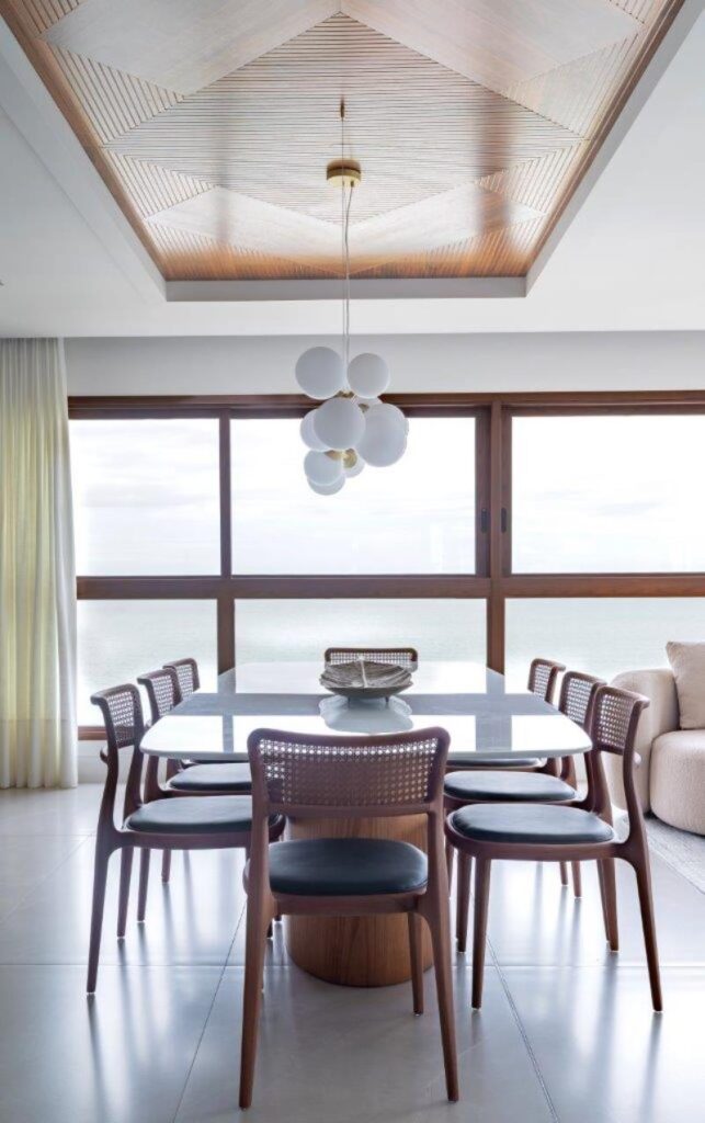 Entre os destaques do projeto estão os painéis em marmoraria que revestem as paredes, o piso em porcelanato no formato 80×160, que amplia visualmente os espaços e oferece elegância, além do mobiliário assinado, como a Poltrona Eixo, da designer Rejane Carvalho Leite, as cadeiras BEC, de Luan Dal Sálvio, e as poltronas giratórias de Pepe Lima, que reforçam o protagonismo do design brasileiro na composição.