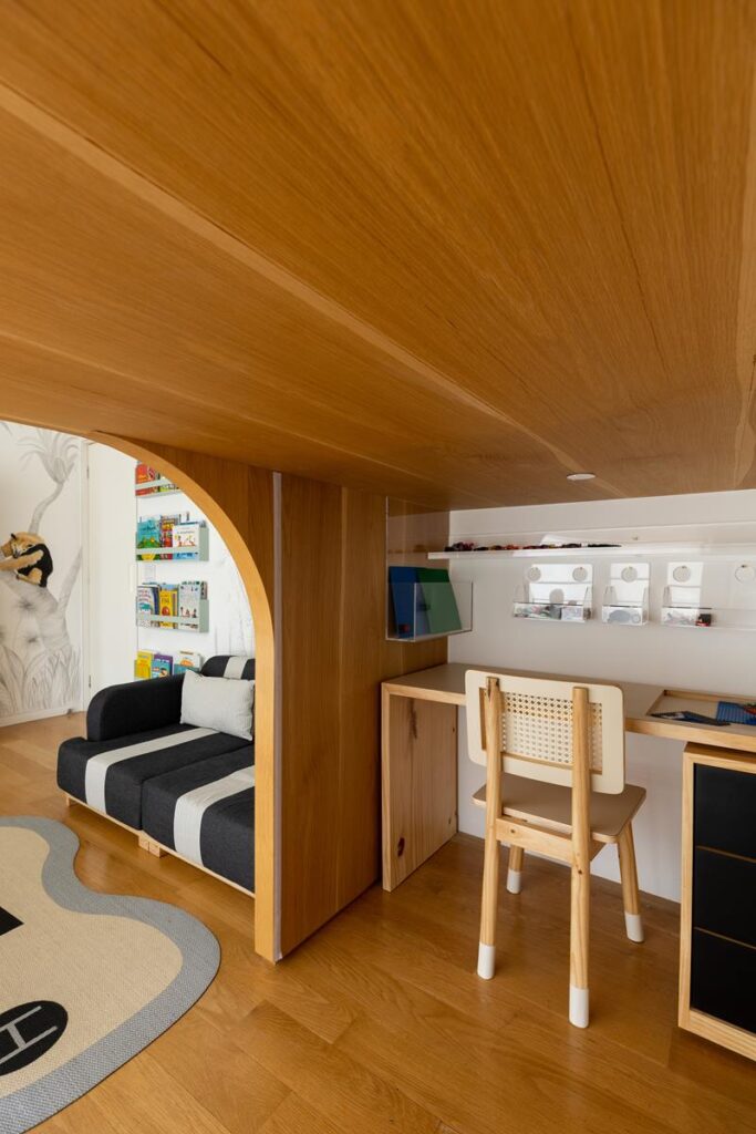 A solução foi dividir o espaço em dois níveis, garantindo usos distintos sem comprometer a convivência. Na parte superior, um pequeno mezanino abriga o canto dos mais velhos, voltado a jogos, leitura e momentos de descanso. A parte inferior foi destinada às brincadeiras e atividades artísticas do caçula, permitindo que todos compartilhem o mesmo ambiente de forma harmônica.