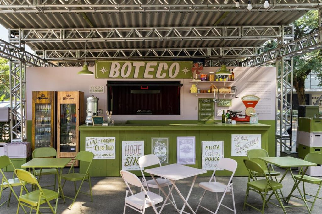 Esse pensamento ganha uma leitura mais direta no Boteco Suvinil, projeto assinado por Nicole Tomazi e Sergio Cabral (@tomazicabral), que parte de um dos símbolos mais reconhecíveis do cotidiano brasileiro para criar um espaço de convivência dentro da Bienal. Mais do que uma instalação, o ambiente funciona como ponto de encontro ao longo do percurso, convidando o público a permanecer, interagir e experimentar o espaço de forma mais espontânea.