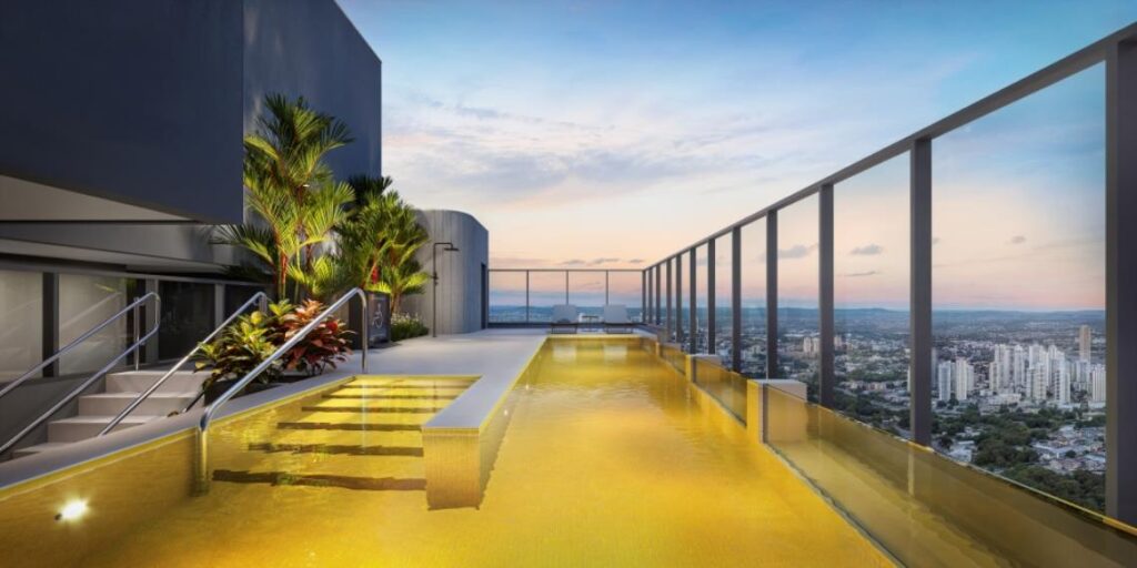 Antes restritas a hotéis de luxo ou casas de celebridades, as piscinas coloridas começaram a ganhar espaço no cenário internacional da arquitetura e, em Goiânia, chegaram pela primeira vez em 2021 com o Emirates Parque Flamboyant. O projeto, assinado pela Sousa Andrade Construtora em parceria com a Terral Incorporadora e a Humanae Incorporadora, apresentou a Red Pool Emirates: uma piscina vermelha com visão panorâmica de 180º no 30º pavimento, a 90 metros de altura.