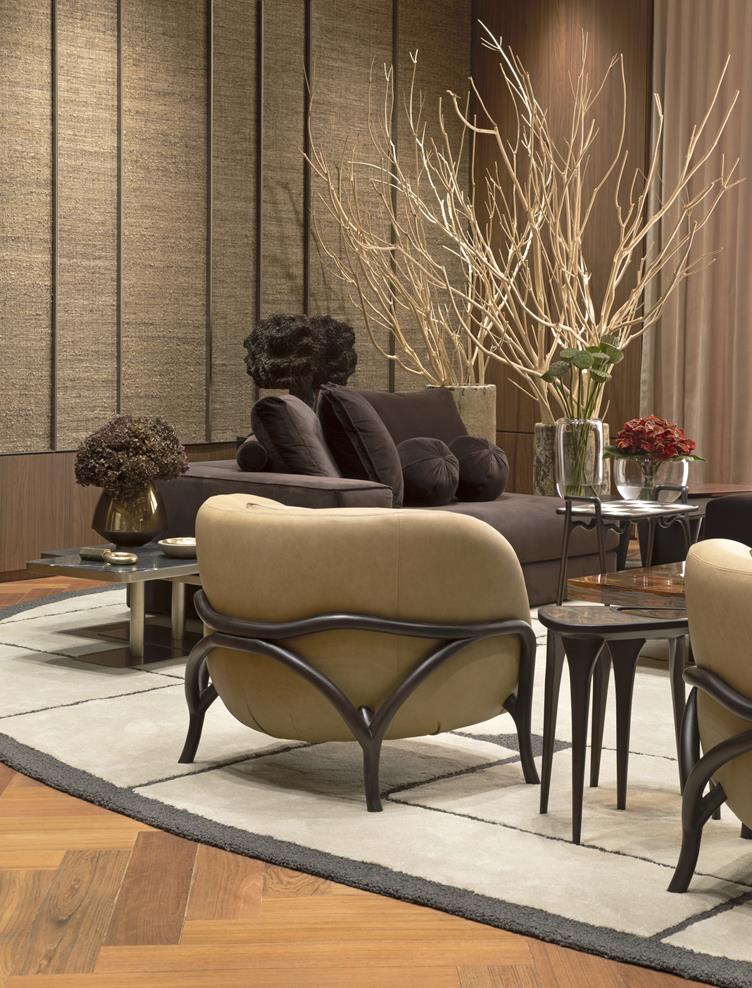 O living, vibrante, é marcado pelo vermelho e pela lareira que aquece os desejos. Já a biblioteca, mais intimista, representa sonhos e liberdade. Essenciais ao equilíbrio da composição, o módulo Maddox, em veludo monocromático, assume papel central, enquanto a poltrona Papillon dialoga com esculturas do artista visual Zé Bento. A mesa de jantar Versa, a cadeira Daphne e as poltronas Luna, além de diversas mesas de centro e laterais, foram escolhidas por guardarem relação direta com a ideia de atemporalidade que norteia o projeto.
