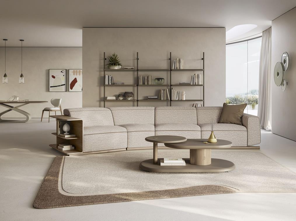 Na área social, o sofá Pagoda, também da Natuzzi Italia, surge como ponto de encontro e contemplação. Suas linhas equilibradas e proporções generosas reforçam a atmosfera de acolhimento, criando um ambiente propício tanto para o convívio quanto para o descanso individual. Um sofá que dialoga com a arquitetura contemporânea e valoriza a permanência.