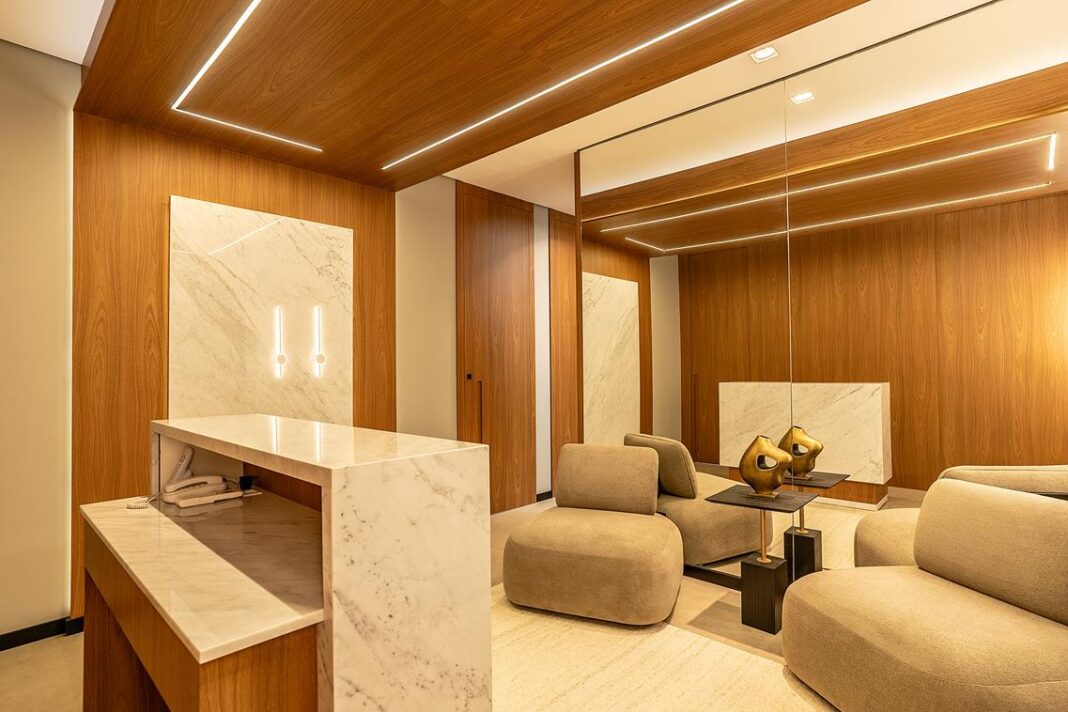 O projeto corporativo assinado pelo arquiteto Marcos Serrano Miralles traduz a força do design contemporâneo aliado ao conforto. Inspirado em uma estética elegante e atemporal, o espaço foi pensado para acolher clientes e colaboradores desde o primeiro passo, valorizando materiais nobres, iluminação bem planejada e uma paleta de cores que transmite sobriedade.