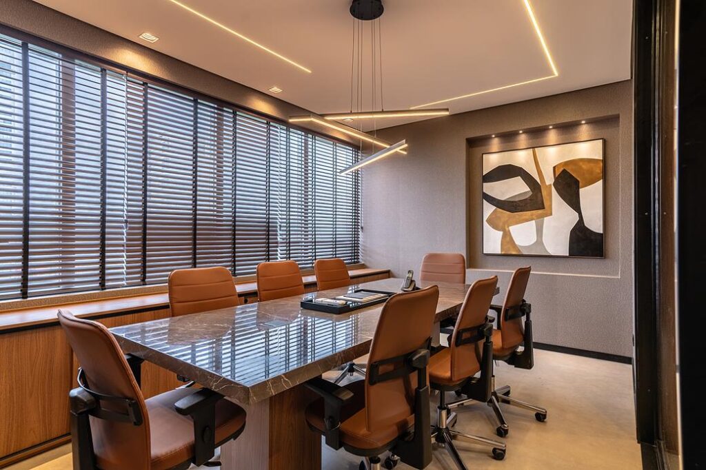 Na sala de reunião, a imponência aparece nos materiais. A mesa de mármore com pé de madeira é o grande destaque, cercada por cadeiras em couro marrom que reforçam a sensação de sofisticação. Um aparador lateral apoia a rotina do ambiente, enquanto a obra de arte ganha protagonismo com iluminação direcionada e recorte na parede. O LED no teto e a luminária linear garantem iluminação eficiente. A presença de uma parede de vidro amplia a percepção do ambiente, enquanto a outra, revestida em marcenaria com porta mimetizada, mantém a harmonia visual.