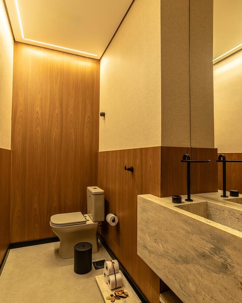 O lavabo segue a identidade do restante do escritório. As paredes recebem marcenaria combinada com papel de parede texturizado, criando uma composição elegante e aconchegante. A cuba esculpida sob medida acompanha o recorte da parede: estreita, funda e feita em pedra, ela valoriza o desenho do espaço. O rodapé preto adiciona personalidade e conversa com os acessórios, equilibrando o espaço.