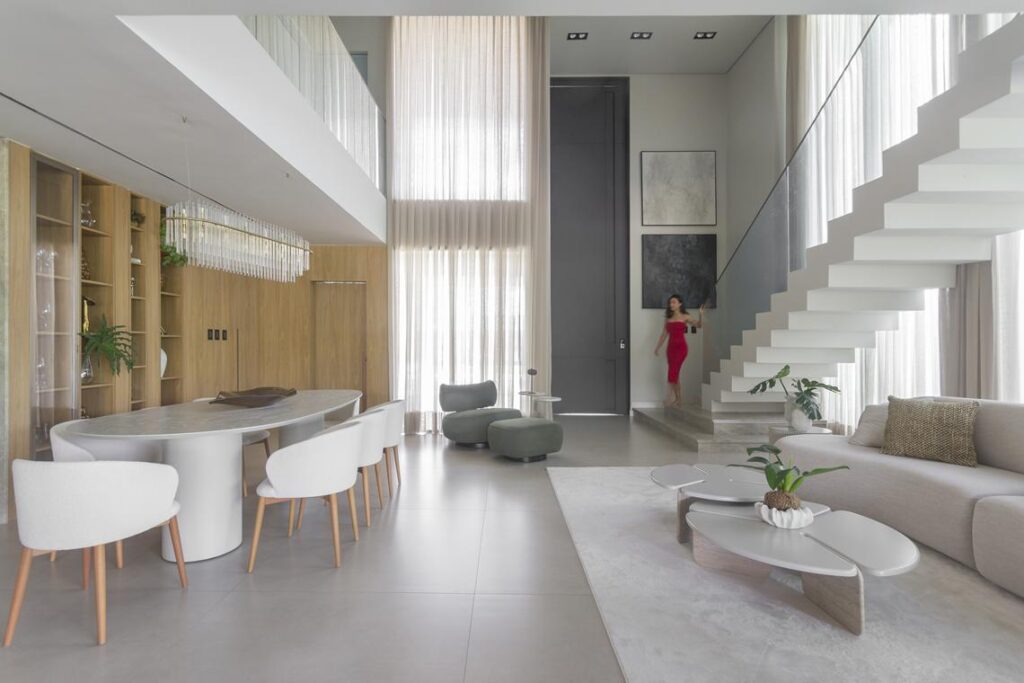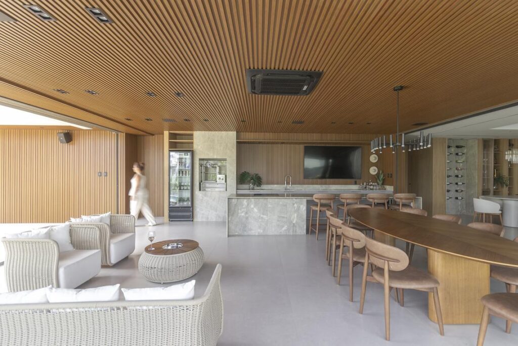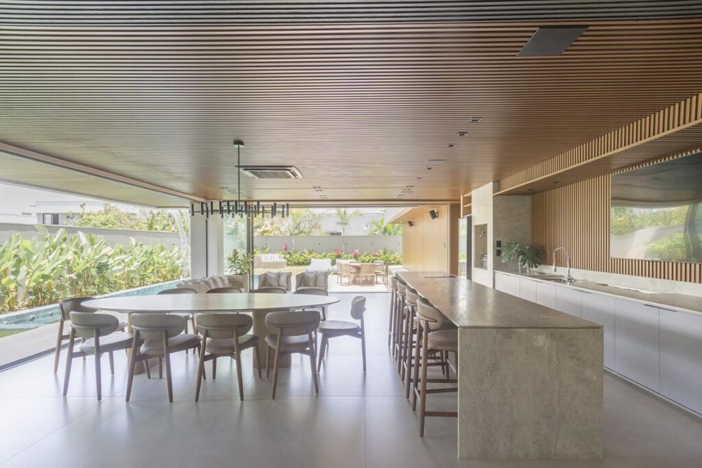 A residência tem no térreo sua área de convivência principal. Salas de estar e jantar se conectam de forma contínua ao espaço gourmet e à área externa, onde a piscina com cascata assume papel central. Materiais quentes, como a madeira e o ripado amadeirado em alumínio composto, contrastam com tons neutros e planos