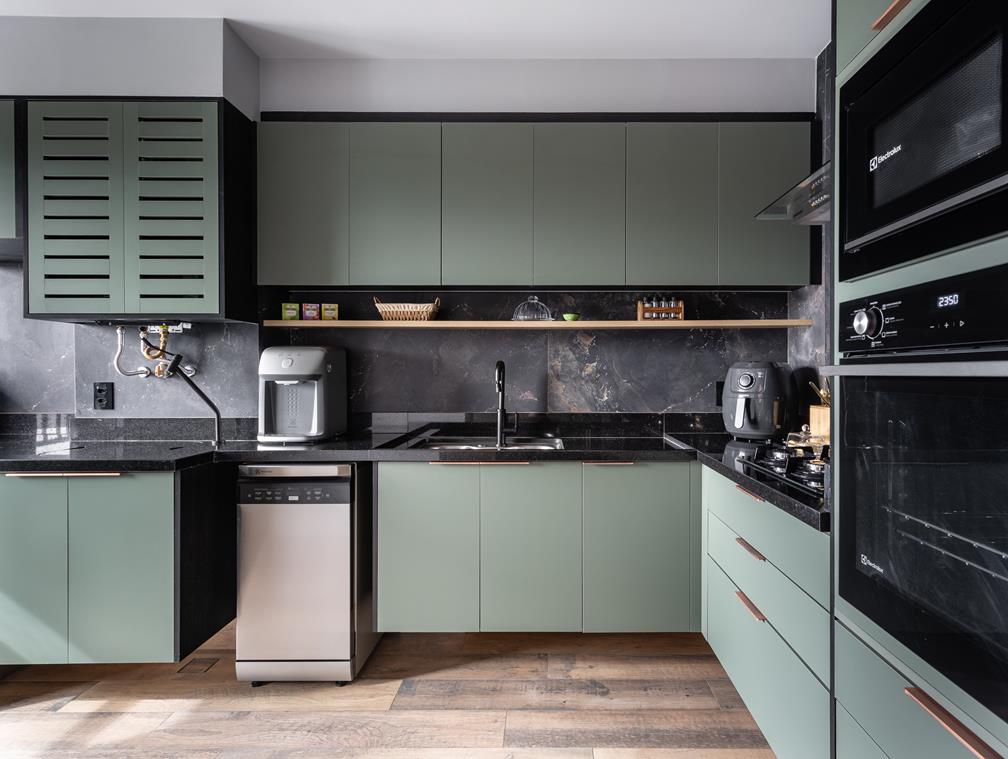 Na cozinha, o cuidado com a estética não compromete a eficiência. A marcenaria em verde