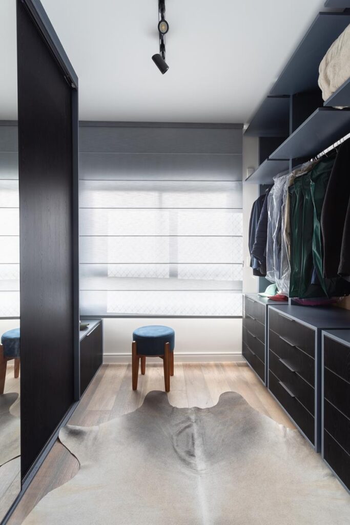visualmente à suíte, reforça a fluidez dos ambientes com marcenaria em tons escuros e