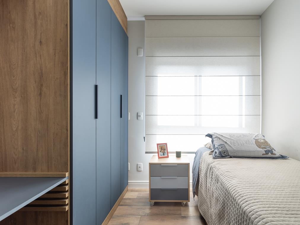 A segunda suíte foi desenhada para funcionar como quarto do filho do morador, com espaço