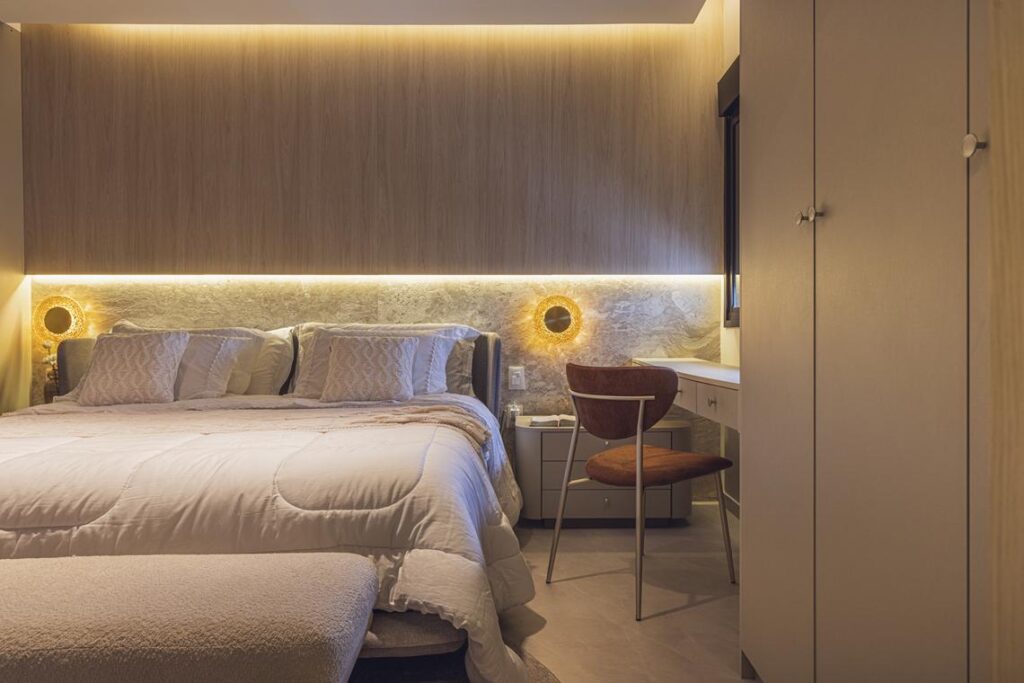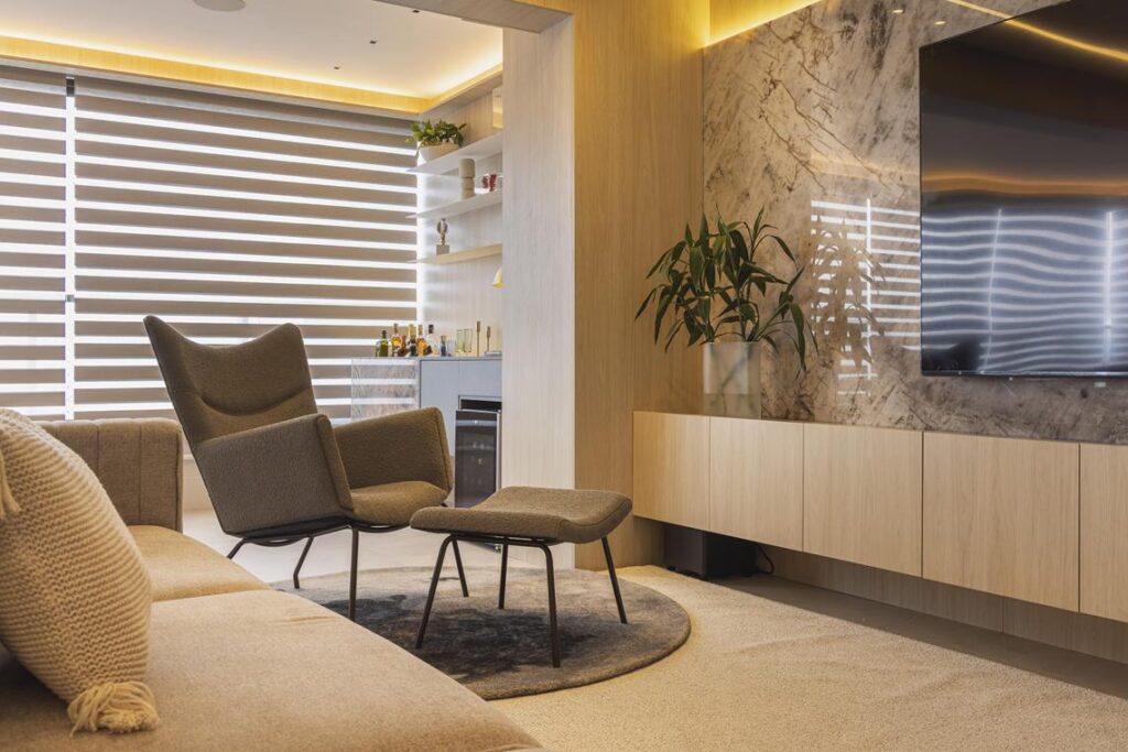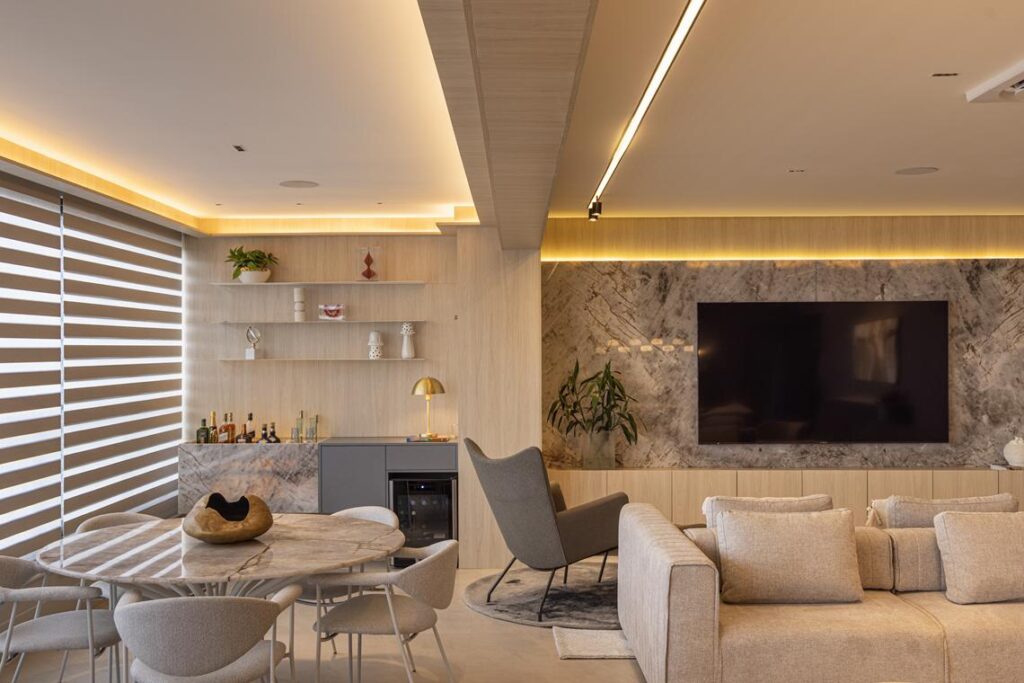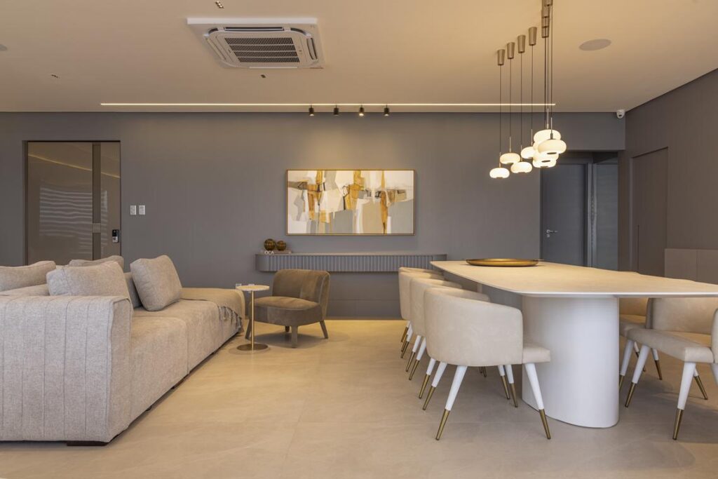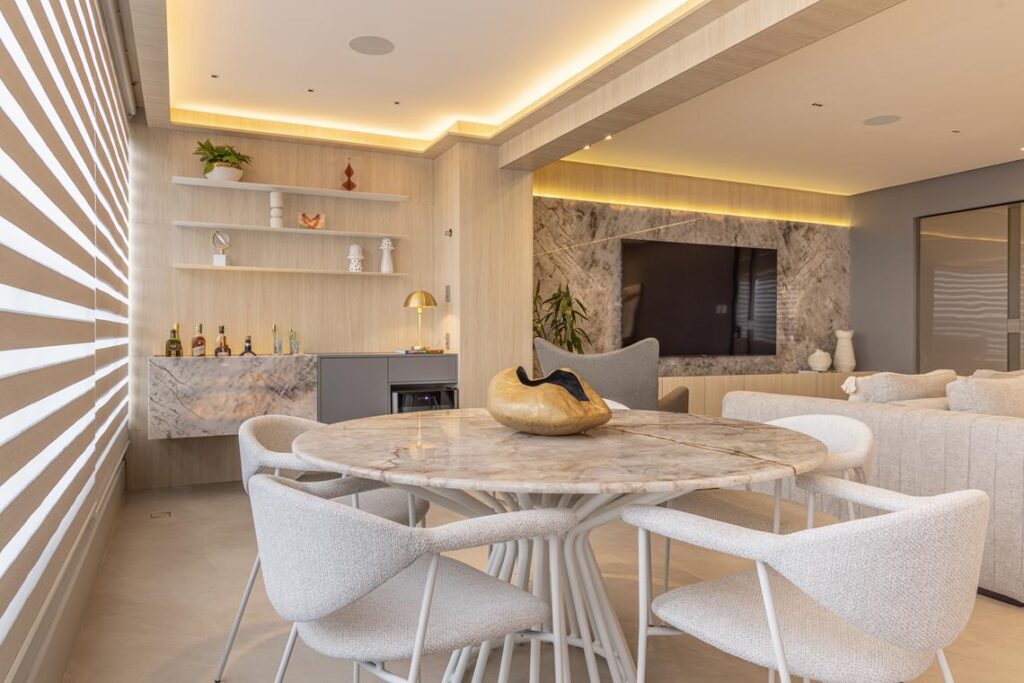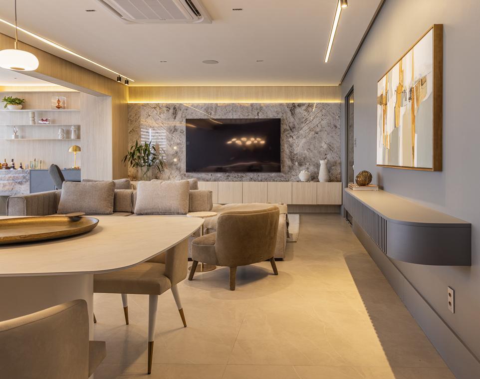 Os mobiliários de linhas contemporâneas, a iluminação pontual e os acabamentos naturais reforçam a unidade estética do projeto, destacando volumes e texturas com sutileza. Cada elemento foi pensado para favorecer a harmonia e o equilíbrio visual, sem abrir mão da funcionalidade.