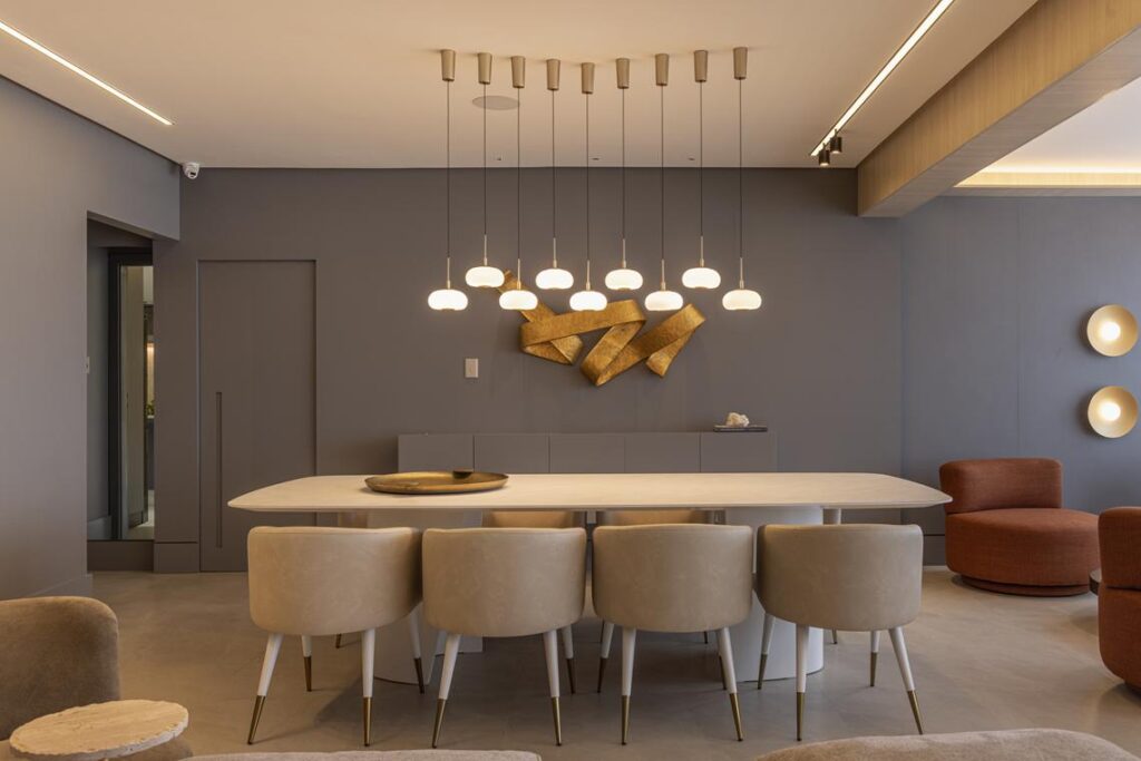 A designer de interiores buscou equilibrar estética e funcionalidade, priorizando o bem-estar da família, o uso fluido dos espaços e a valorização da convivência. “A área social foi pensada para receber os amigos com conforto, enquanto a área íntima preserva a tranquilidade e o aconchego do lar”, acrescenta Cinthia.