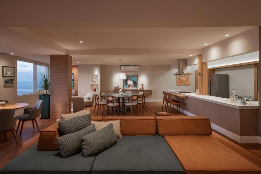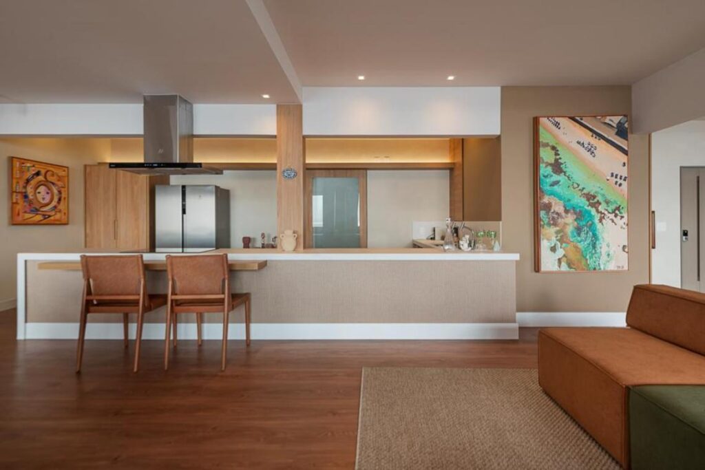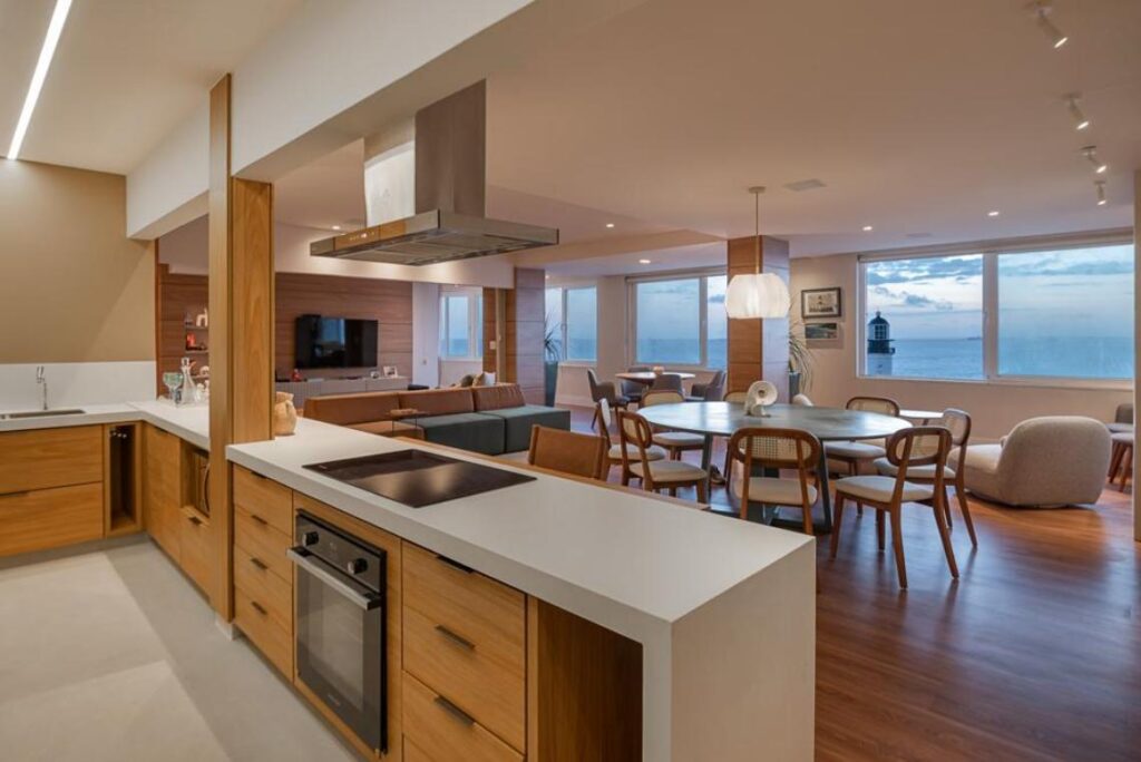 A cozinha ampla conecta-se à área social por um balcão rebaixado, permitindo vista total para o mar. A solução ajusta as circulações e favorece o uso cotidiano e o convívio. Como o edifício possui vigas baixas, a equipe teve atenção especial à iluminação e ao desenho dos forros. O piso foi elevado para potencializar a perspectiva da paisagem e melhorar a proporção entre os ambientes.