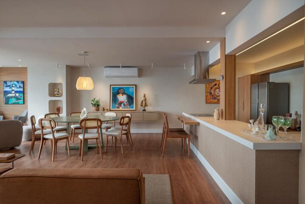 No projeto de interiores, as escolhas priorizam linhas discretas, funcionais e resistentes. Mesas amplas e um sofá em ilha permitem diferentes configurações para receber grupos variados, adaptando o espaço conforme as necessidades da família. Para completar, o apartamento apresenta obras de arte de artistas baianos admirados pelos clientes, como Waldeth Garcez, Fred Sá e Galeano.