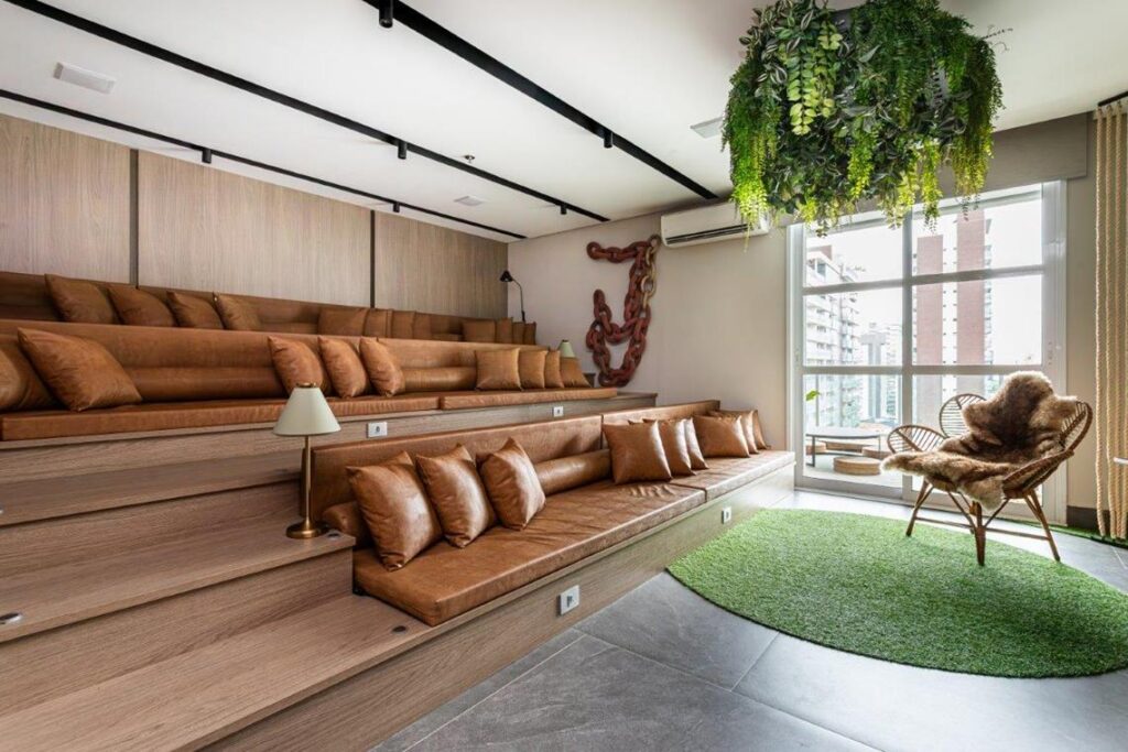 Inserido em uma região empresarial da cidade, o espaço foi concebido como um ambiente multifuncional, reunindo áreas cuidadosamente desenhadas para diferentes tipos de atividades. O programa inclui recepção, dois consultórios de psicologia, uma sala multiuso, um estúdio de gravação de podcast completamente equipado, um espaço de coffee break e bar, além da arena propriamente dita, um auditório em formato de arquibancada, com capacidade para até 25 pessoas, ideal para apresentações e treinamentos empresariais. Há ainda lavabos de acesso universal e varandas com sofás, bancos e mesas que promovem momentos de integração e descanso entre os usuários.
