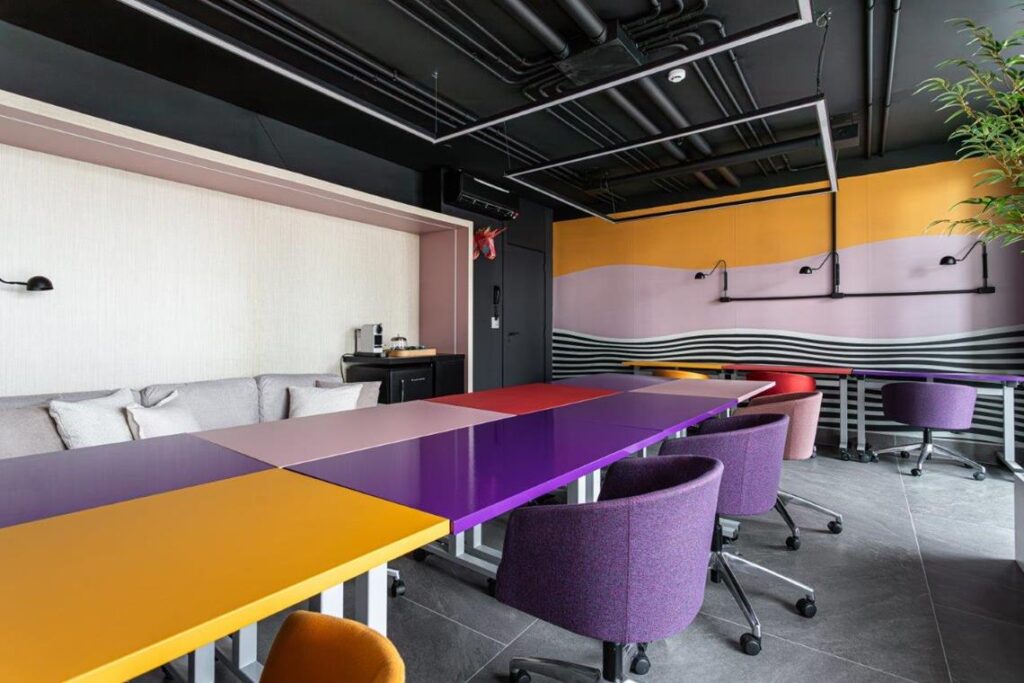 A sala multiuso segue uma estética industrial e descontraída, com cores vibrantes e mesas componíveis, enquanto o estúdio de podcast combina tecnologia e cenografia, com cordas e iluminação cênica que equilibram o técnico e o artístico. Nos lavabos, detalhes inesperados reforçam a proposta lúdica, como as toalhas que exibem mensagens inspiradoras e as esculturas de formigas que surgem como pequenas surpresas visuais.