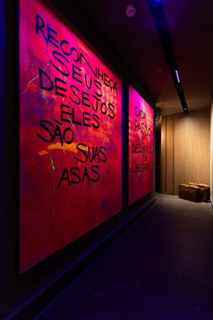 A ludicidade se tornou o fio condutor do projeto. Cada ambiente foi pensado como uma experiência sensorial, capaz de despertar emoções e reflexões. Na recepção, o conceito parte da ideia de uma floresta densa e escura. Sofás envolventes garantem privacidade mesmo em um espaço coletivo, enquanto a iluminação cênica e as obras de arte convidam à introspecção. O corredor, com luz dramática e obras que exaltam liberdade, estimula o visitante a pausar e pensar.