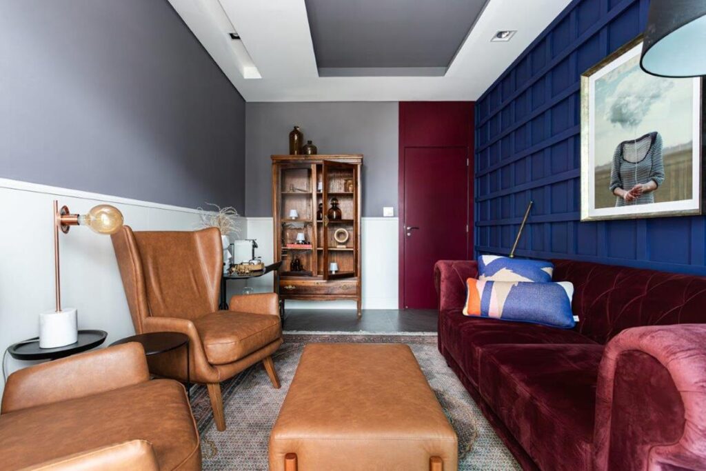 Os consultórios reinterpretam a sala clássica de um analista, com lambris, painéis, tecidos pesados e veludos, além de iluminação quente e indireta que reforça o conforto e a sensação de familiaridade. Cada sala é identificada por uma cor marcante, como o bordô e o mostarda. No espaço de coffee break e na arena, o piso de grama com desenhos orgânicos, a vegetação pendente e elementos de época, como a geladeira retrô laranja-choque, criam uma atmosfera divertida e acolhedora. Bancos de futons e almofadas completam o ambiente, convidando ao relaxamento.