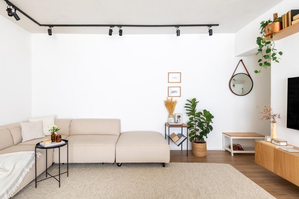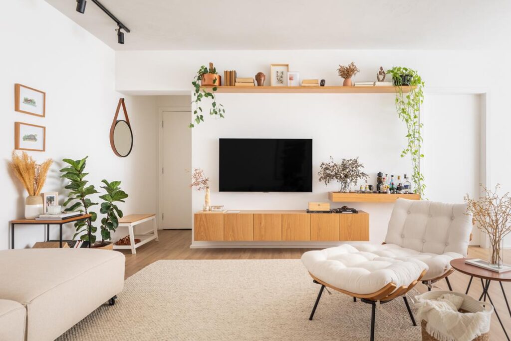 Logo na sala, o rack desenhado sob medida se estende com leveza, ganhando novas funções e se transformando em um bar descomplicado, perfeito para receber com charme e praticidade. Um volume flutuante, quase escultural, abriga livros, objetos afetivos e uma seleção de bebidas, compondo uma atmosfera despretensiosamente elegante. Acima dele, a prateleira alta sustenta plantas pendentes e pequenos tesouros decorativos, equilibrando a verticalidade com frescor. No mesmo espaço, os quadros aquarelados revelam lembranças de viagens, registros que eternizam paisagens e conectam a casa à trajetória pessoal do casal que ali mora.