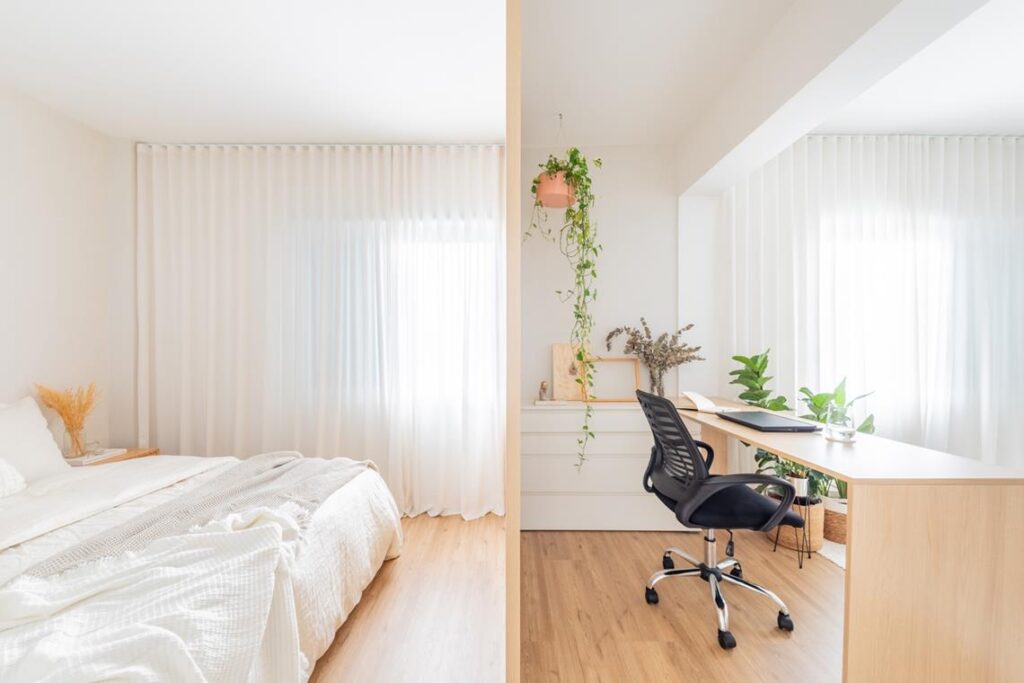 O home office integrado ao quarto é uma das soluções mais sutis e bem resolvidas do projeto. Em vez de delimitar espaços com rigidez, Mirella preferiu uma integração fluida, onde o mobiliário em madeira clara se insere com naturalidade na linguagem do ambiente. O desenho limpo da escrivaninha, cria um canto produtivo e acolhedor, sem romper com a atmosfera serena do dormitório, que se conecta perfeitamente com a área social do apartamento, usando o mesmo mix de texturas e materiais.