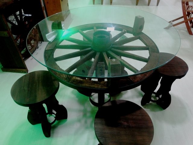 A robustez, resistência e durabilidade podem ser aproveitadas tanto na área interna como na externa, e esta foi a aposta da linha Estância, da Madelustre, feita de peças oriundas de madeira de demolição. A mesa do conjunto, por exemplo, é feita com a reutilização de roda de carroça que recebeu tratamento de metal oxidado envelhecido.