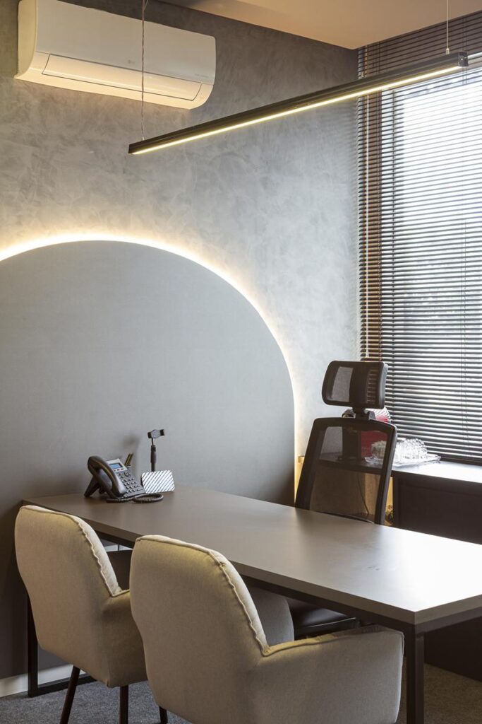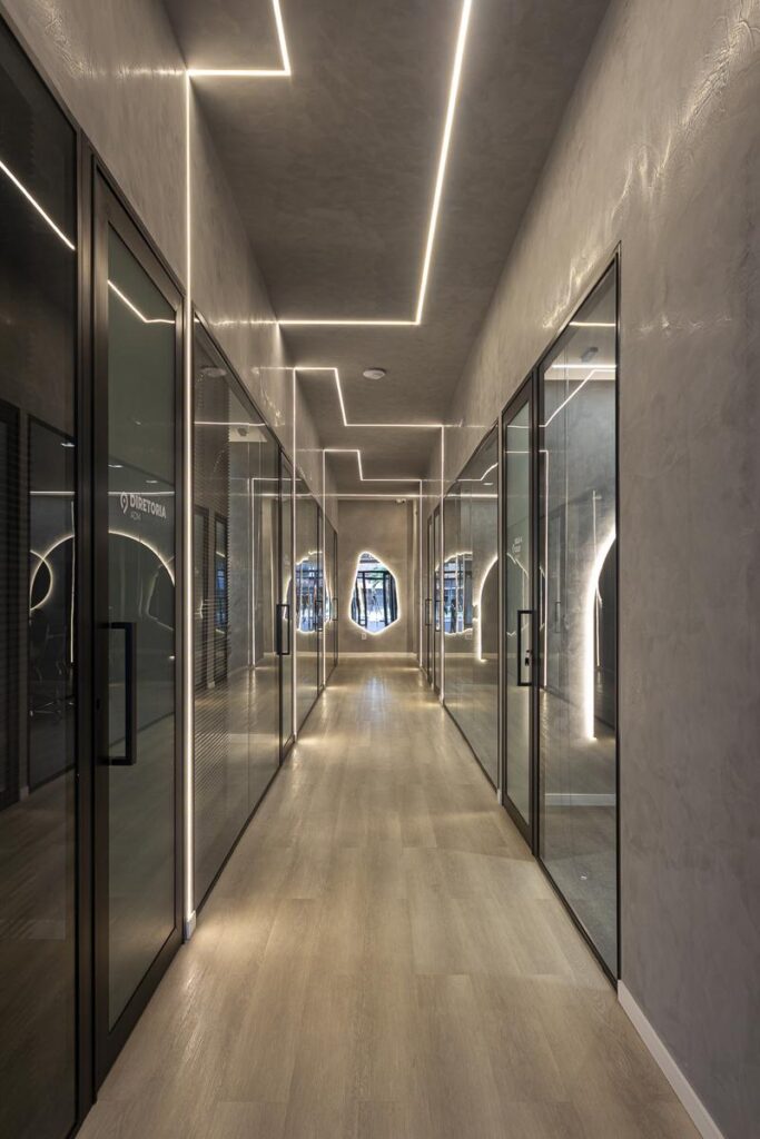 A arquitetura se estrutura a partir de linhas puras e volumetria equilibrada. O uso do vidro e de elementos metálicos em acabamento fosco expressa a identidade do projeto, enquanto a paleta neutra, pontuada por tons elegantes e iluminação cênica, cria uma atmosfera de acolhimento e foco, refletindo o equilíbrio entre produtividade e bem-estar.