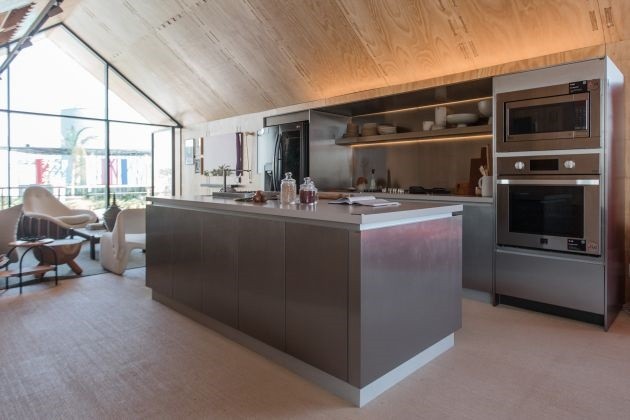 Primeira cozinha planejada produzida no país com portas e tamponamentos em aço inox.