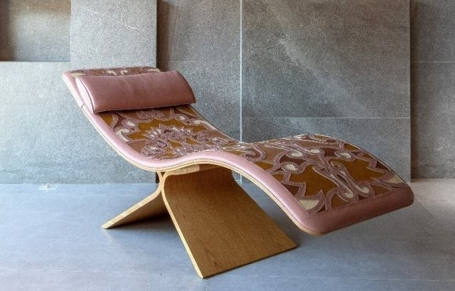 A beleza das curvas e a elegância da madeira natural realçam o design da chaise Paso Doble, criação da Fahrer, cuja inspiração nasceu durante uma viagem de Sergio Fahrer a Buenos Aires. Ao presenciar uma apresentação de tango no bairro de San Telmo, o designer se encantou com a imagem criada pela composição das curvas sinuosas de um guitarón – um violão com corpo maior – e o entrelaçamento gracioso das pernas dos dançarinos que realizavam o famoso movimento Paso Doble.
