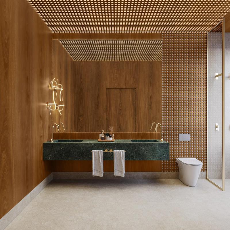 O padrão Cambará apresenta tonalidade quente e envolvente, com veios marcantes que remetem à madeira natural e criam uma atmosfera acolhedora e sofisticada. Já o Carvalho Itapuã aposta em uma leitura mais suave e equilibrada, com desenho elegante e tonalidade versátil, pensada para composições que transitam entre o contemporâneo e o atemporal.