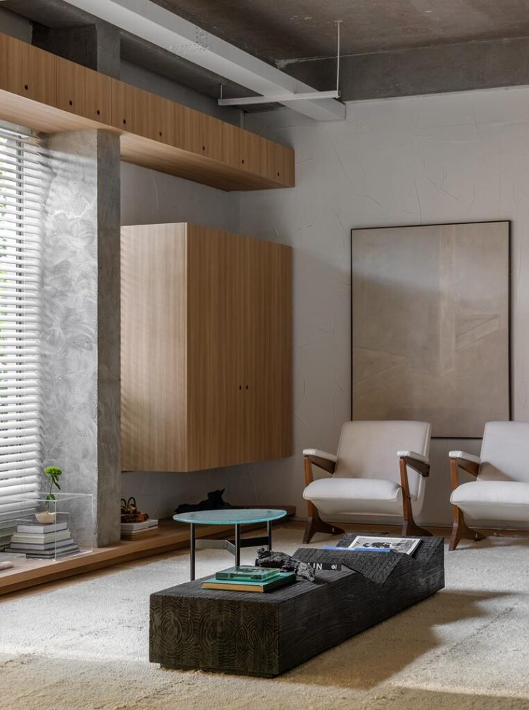No desenho do mobiliário, a estante com uma série de portinhas na parte superior, sugere as preciosidades, pequenas no tamanho e enormes no sentimento, que são bem guardadas pelo morador da Casa Retrato. A mesa de centro, também desenhada pelo Studio Gabriel Bordin, apresenta vincos que servem para deixar os livros abertos, nas páginas mais importantes.
