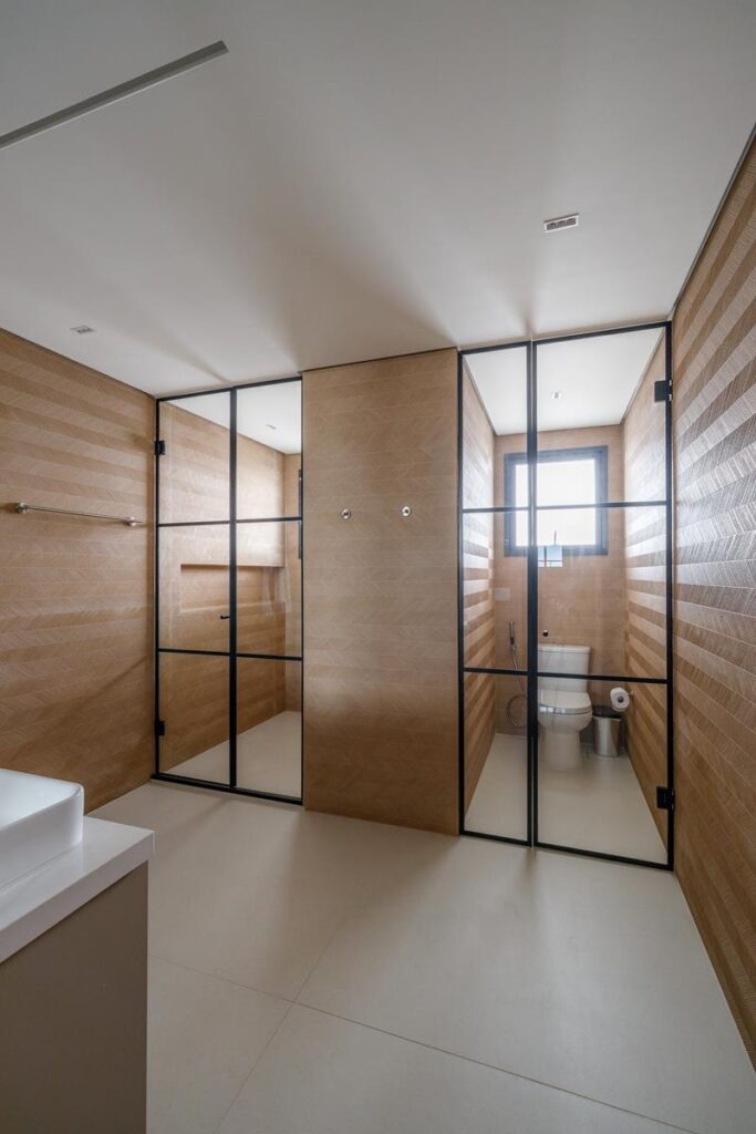 para chuveiro e bacia sanitária. Já o segundo banheiro ganha um conceito mais clean, com box