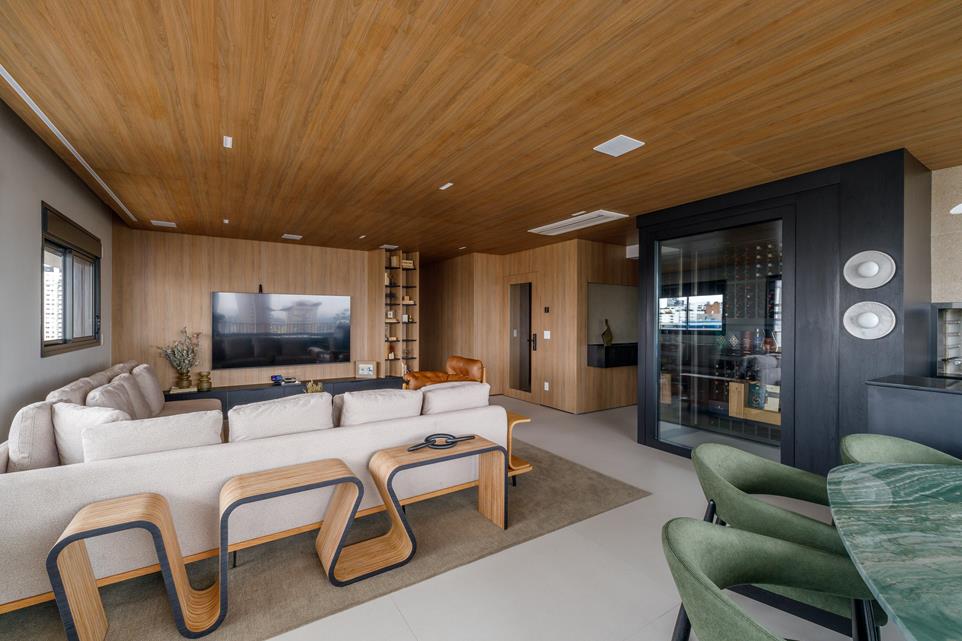o projeto aposta em uma linguagem contemporânea. A madeira aparece em forros, painéis e