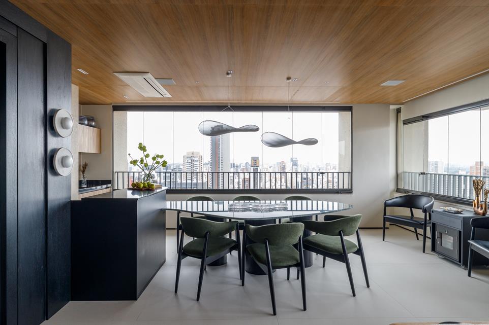 espaço amplo e fluido, ideal para receber. O forro em madeira aquece visualmente, enquanto