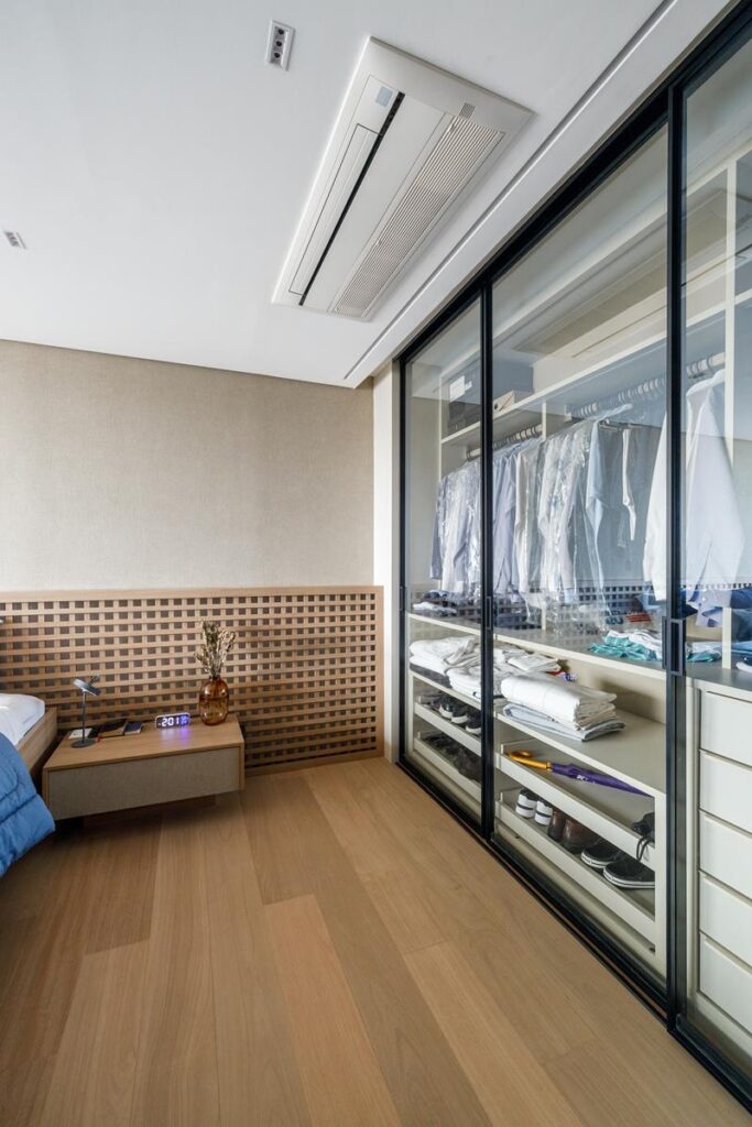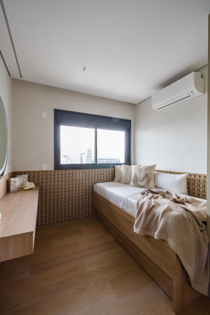 muxarabi com tela tensionada retroiluminada, cama sob medida e armário com portas de vidro. O papel de parede em linho complementa o ambiente com textura e aconchego. O