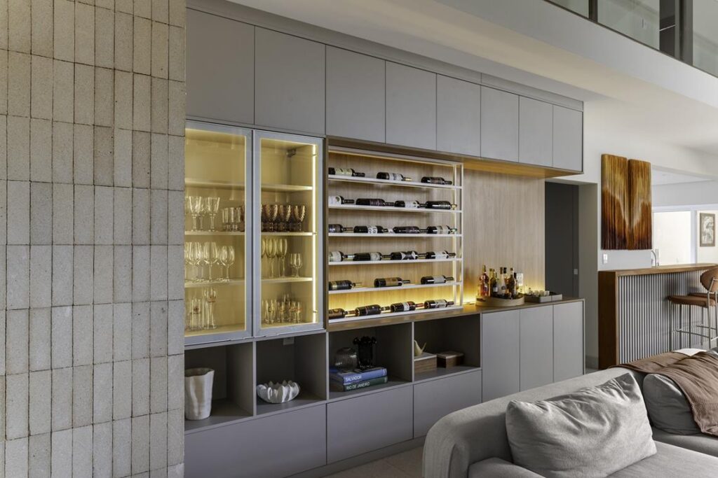 Ao fundo do ambiente social, a adega sob medida se apresenta como um dos destaques da marcenaria. Assinada pela Celmar, a peça conta com detalhes da linha Metallo, portas em vidro que permitem a exposição das garrafas de vinho e uma composição inteligente, com diversos compartimentos e nichos integrados, aliando organização, funcionalidade e apuro estético.