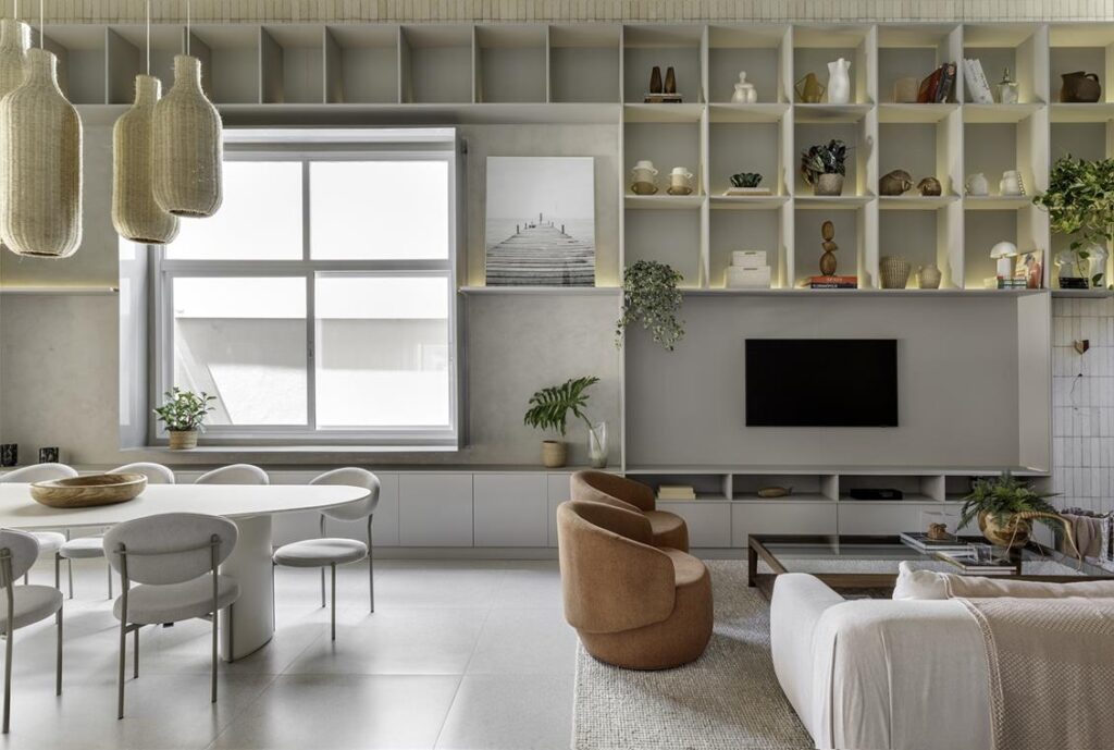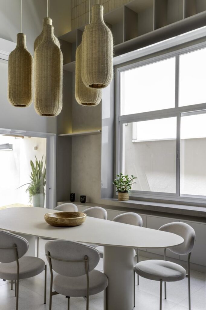 Os ambientes seguem uma paleta de tons neutros, que serve de base para a inserção de peças com forte referência à brasilidade. Elementos em palinha, poltronas em tons terrosos, luminárias em linho e uma mesa de jantar para oito lugares compõem um espaço acolhedor e sofisticado, potencializado pela ampla entrada de iluminação natural, que reforça a sensação de conforto e bem-estar.