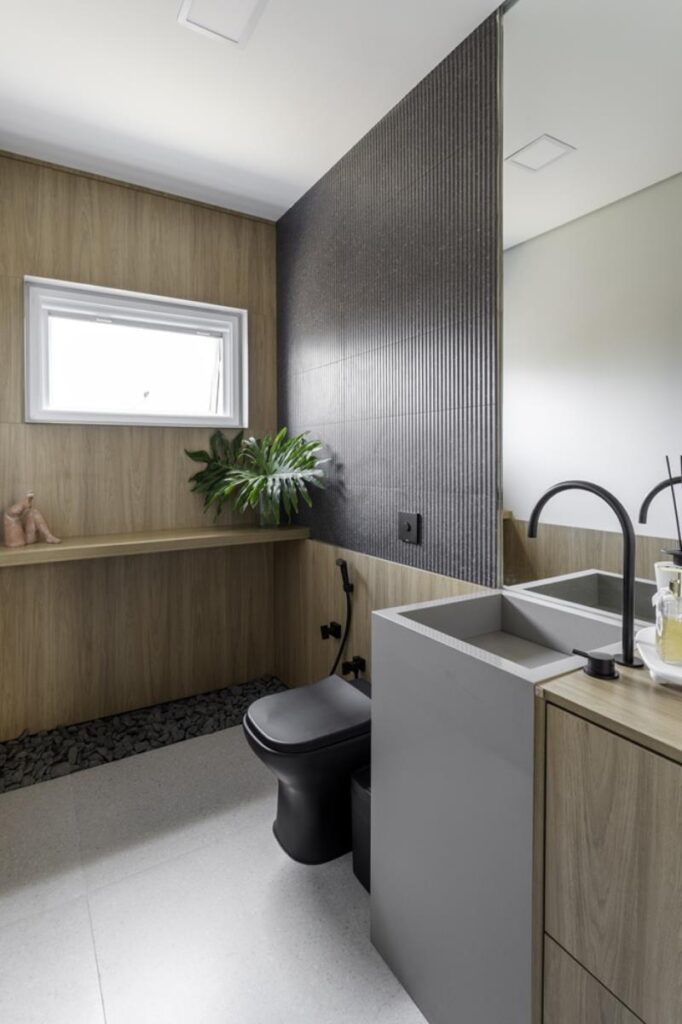 No lavabo, a marcenaria segue como elemento essencial na construção da atmosfera. O painel que reveste a parede, em conjunto com a marcenaria lateral da pia, cria um ambiente aconchegante e elegante, evidenciando o cuidado com os acabamentos e a coerência visual do projeto como um todo.