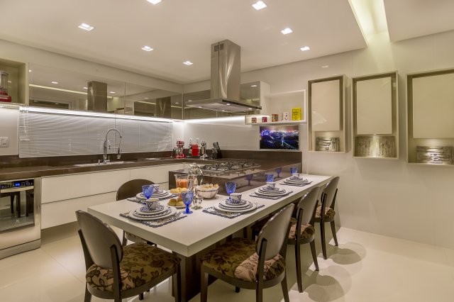 A integração da cozinha com a sala de jantar foi feita através de portas em PVC da Solaris. A caprichosa marcenaria, da Simas Móveis, destacou os materiais e a ambientação luminotécnica, enchendo de sofisticação todo o composto. As bancadas em silestone são da Maram, os pisos, revestimentos e eletros, da Cerqueira Stylo.