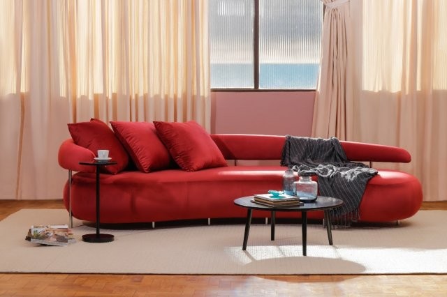 “A visão minimalista do conjunto orienta a construção de uma estética que é reflexo de parâmetros funcionais, técnicos e psicológicos. O sofá curvo foi pensado para ser um refúgio aconchegante e harmônico, que busca referência não em elementos externos, mas sim na essência da usabilidade humana.