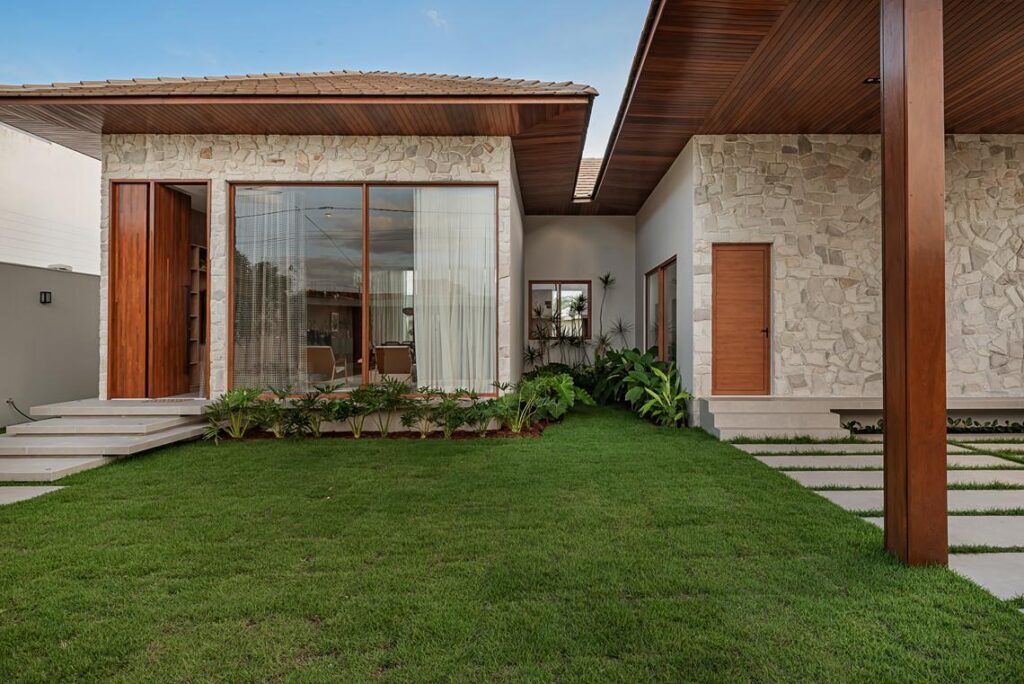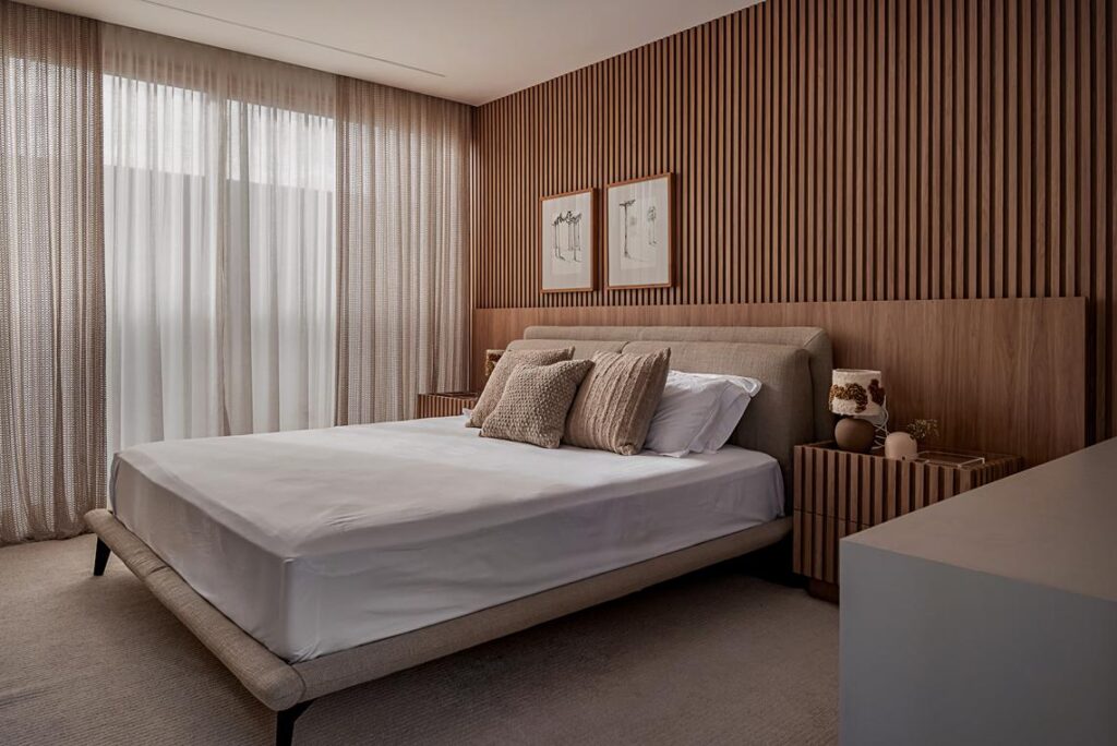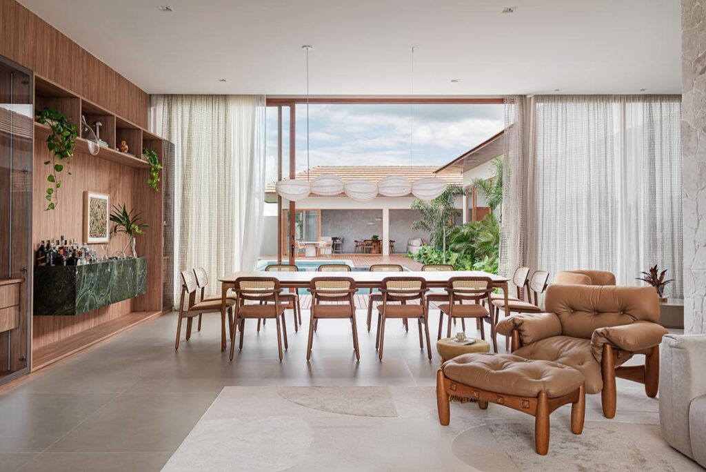 Nos interiores, o projeto utiliza materiais naturais e texturas marcantes para compor uma paleta neutra aplicada de forma uniforme em toda a residência. Madeira, couro, pedra e cortinas em telinha estruturam a continuidade entre estar, circulação, suítes e área de convivência, mantendo coerência entre superfícies, mobiliário fixo e acabamentos.