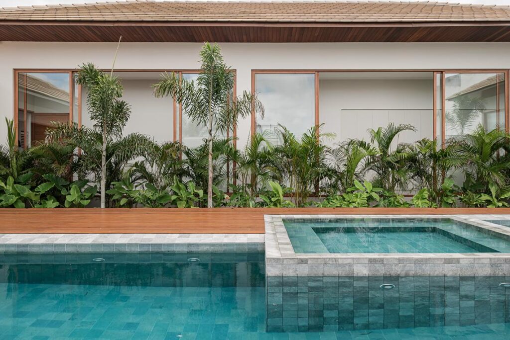“O desafio foi criar um layout fluido e integrado, que valorizasse a ventilação e a iluminação natural”, comenta. A posição dos volumes e das aberturas define a relação direta entre sala, cozinha, varanda e área externa. O paisagismo foi pensado como protagonista, ajudando no controle da incidência solar e trazendo frescor para os ambientes.