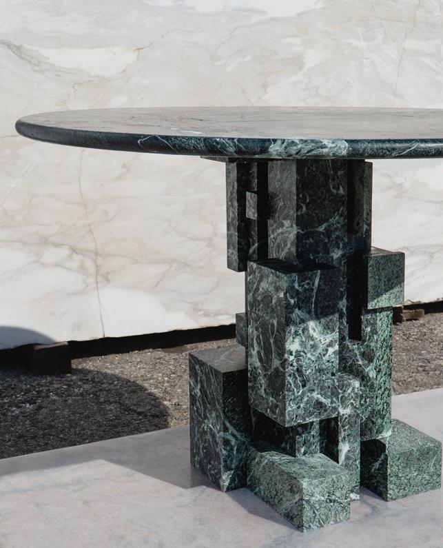 O resultado são peças que remetem a objetos de design e arte e fazem referência a projetos arquitetônicos: um aparador cujo tampo parece ser erguido por blocos geométricos; uma mesa de jantar que, invertida, lembra uma maquete de arquitetura; ou um banco que também funciona como mesa de centro. “Quando se tira o tampo do aparador, por exemplo, parece que é realmente o projeto de um edifício, uma maquete em escala menor. É a arquitetura brutalista brasileira em sua essência: formas geométricas encaixadas, sobrepostas, em blocos puros.”