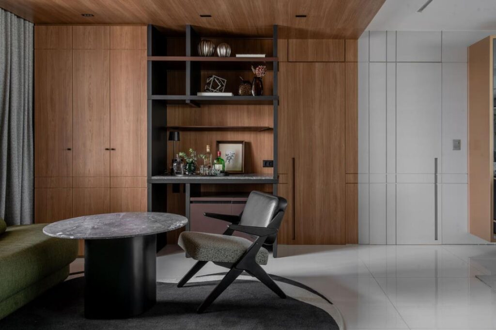 Ao fundo, o bar elegante com marcenaria preta e cristaleira iluminada cria um ambiente funcional e ao mesmo tempo intimista. O teto amadeirado, além de reforçar o aconchego, ajuda a delimitar visualmente o espaço. Outro ponto alto do apartamento são as circulações, revestidas com painéis de madeira clara e escura em alternância rítmica.
