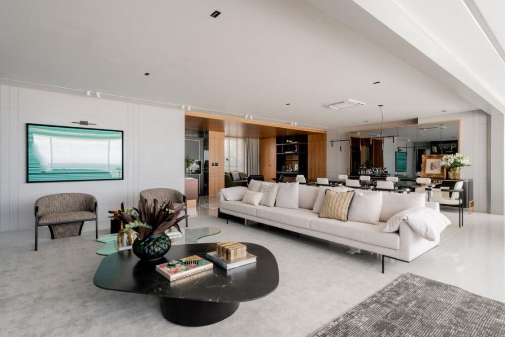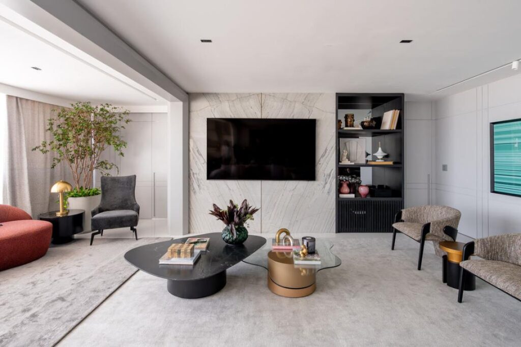 A base neutra em tons de cinza, branco e off-white é aquecida por painéis e forros em madeira natural. As pedras naturais — utilizadas em bancadas e painéis — oferecem um contraste sofisticado. No mobiliário, predomina uma linguagem contemporânea, elegante e confortável. “A decoração aposta em peças de design limpo, com bases neutras e texturas ricas”, pontua o arquiteto.