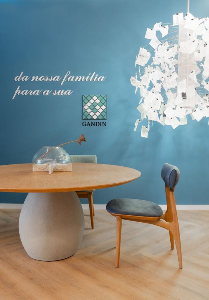 Com 64 m2, o espaço traduz a essência da Construtora Gandin, marca familiar que constrói histórias com propósito e afeto. Em bege e azul, é um convite à reflexão sobre o tempo e seus caminhos. A trajetória da empresa ganha forma em detalhes que unem passado, presente e futuro. A luminária interativa, inspirada no icônico Zettel’z, de Ingo Maurer, convida o público a participar com bilhetes que tornam o espaço ainda mais vivo. “Da nossa família para a sua”: mais do que um lema, um gesto de cuidado.