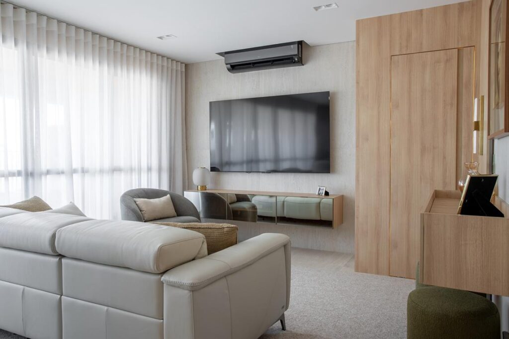 A sala de televisão recebeu uma solução inteligente de marcenaria, com o revestimento de toda a parede, que além de valorizar o espaço, oculta a porta de acesso e garante unidade visual. Ao lado, um aparador suspenso em madeira clara equilibra o ambiente e conversa diretamente com os tons de cinza da cozinha, reforçando a paleta escolhida para o apartamento.
