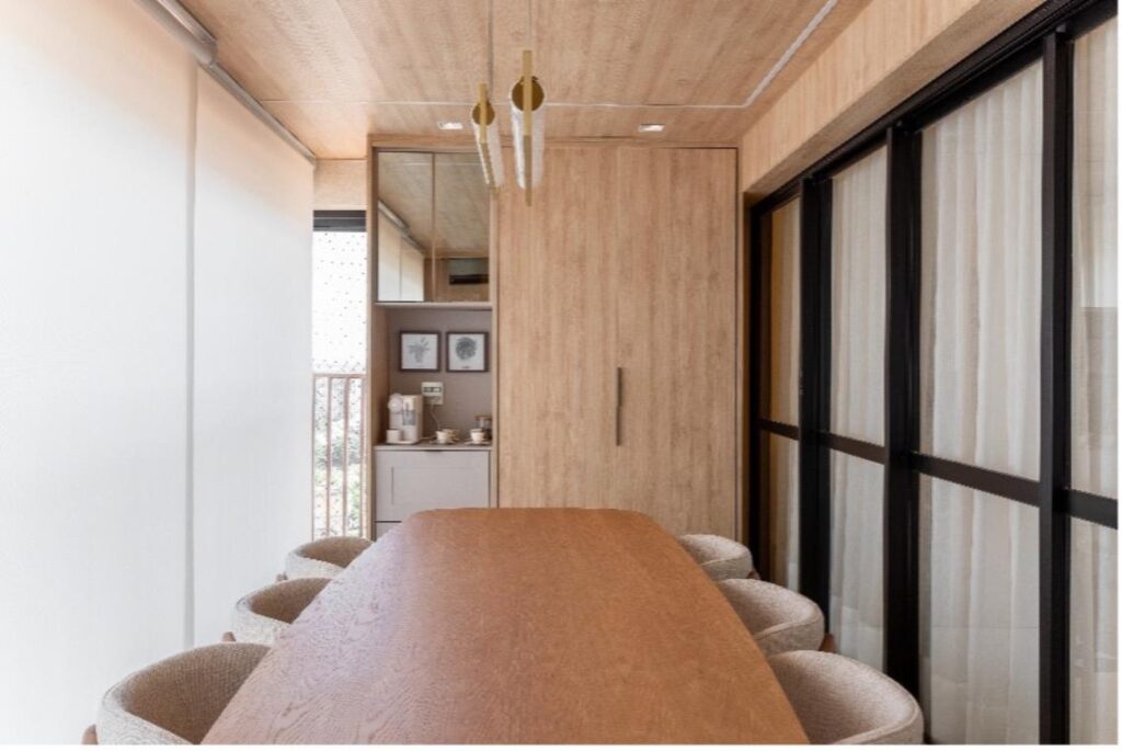 Na varanda gourmet integrada à sala de jantar, a marcenaria também ganha destaque. O teto revestido cria um efeito acolhedor e sofisticado, enquanto o armário multiuso combina portas de vidro e portas em marcenaria. Uma lateral foi pensada especialmente para o espaço do café e, do outro lado, o espaço gourmet abriga churrasqueira e acessórios, tornando o ambiente funcional e convidativo para receber.